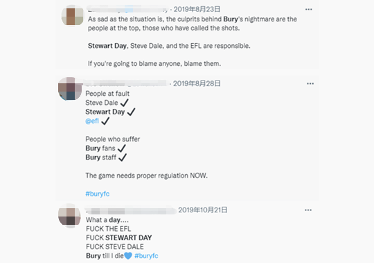 社交媒体上伯里球迷对相关责任方的指责