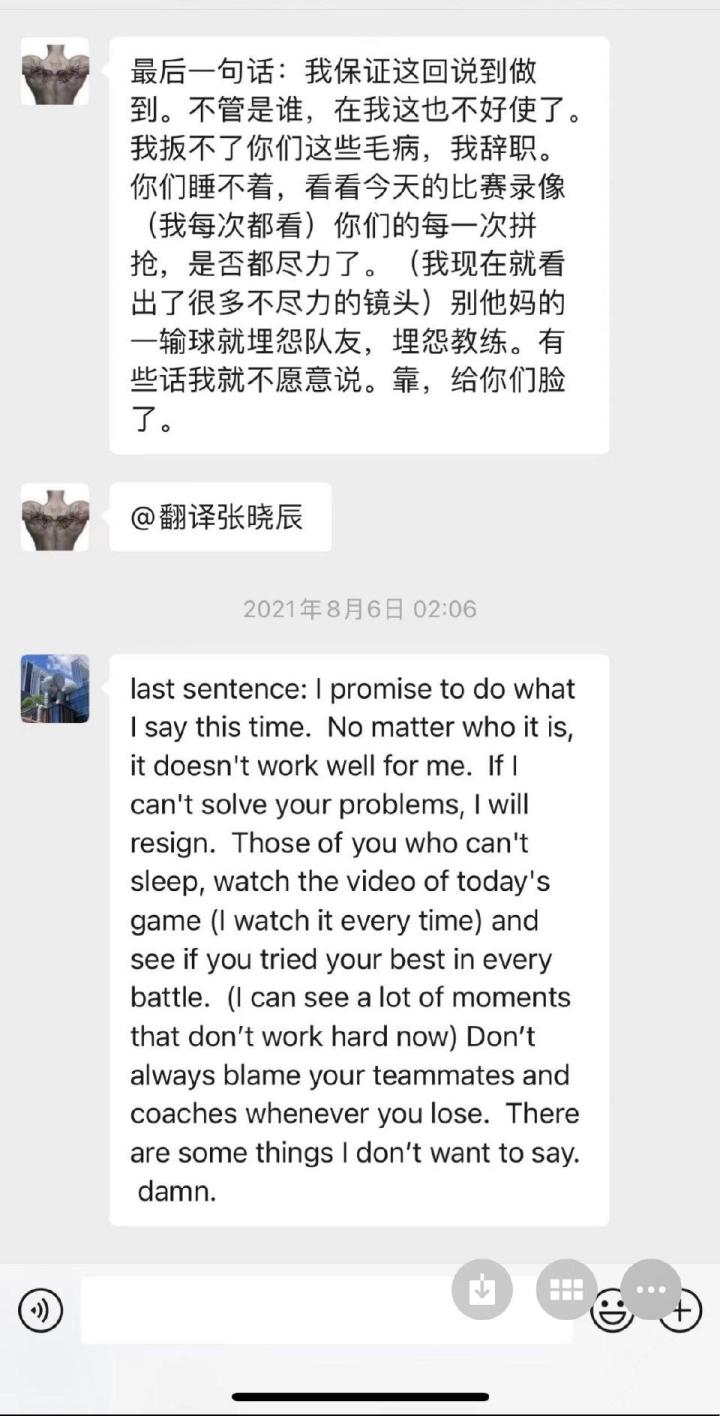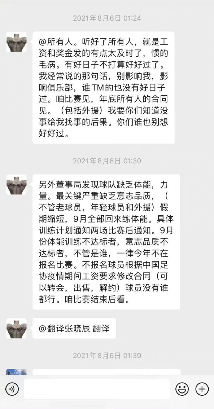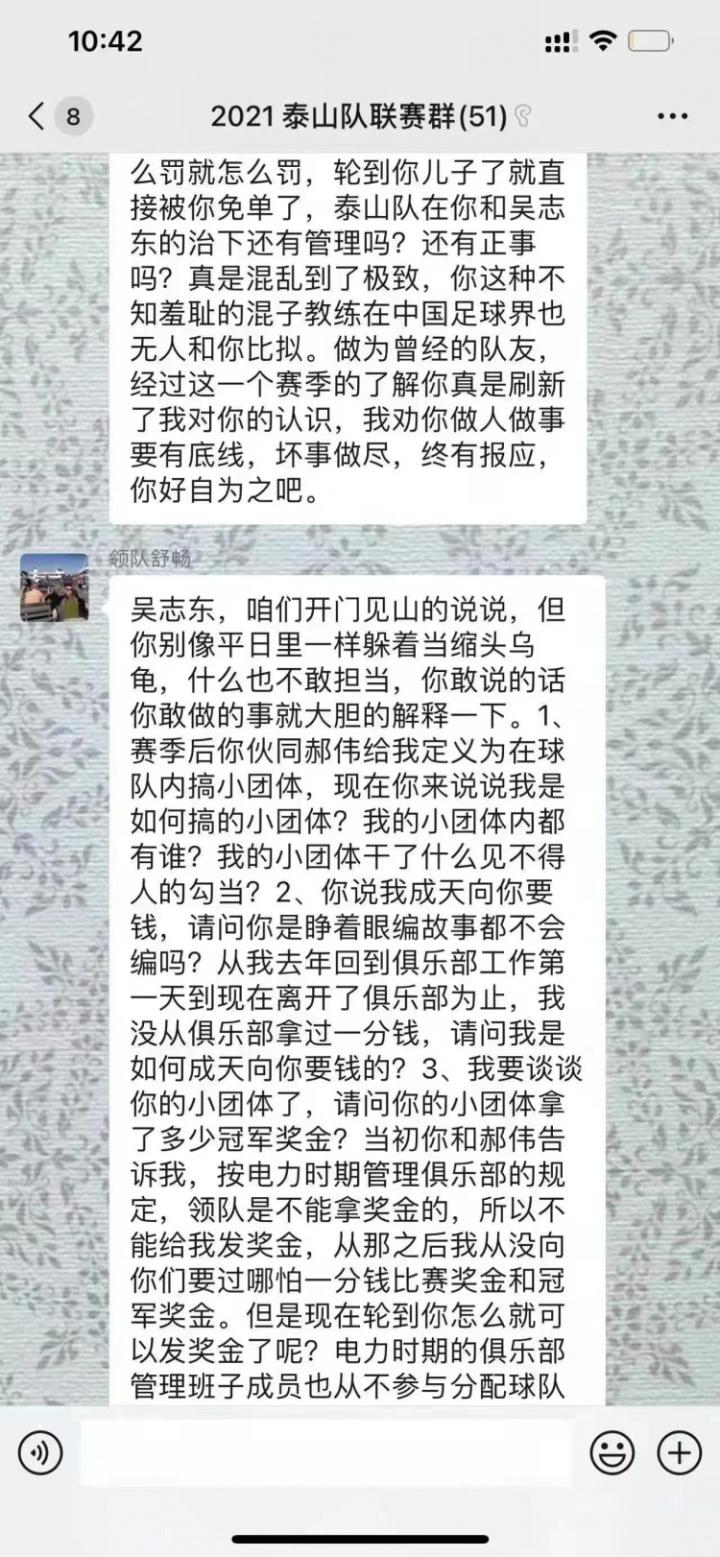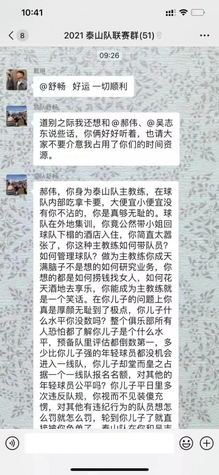已经离队准备前往美国的前任球队领队舒畅,在俱乐部的微信群中怒喷了主教练郝伟和俱乐部董事长吴志东。