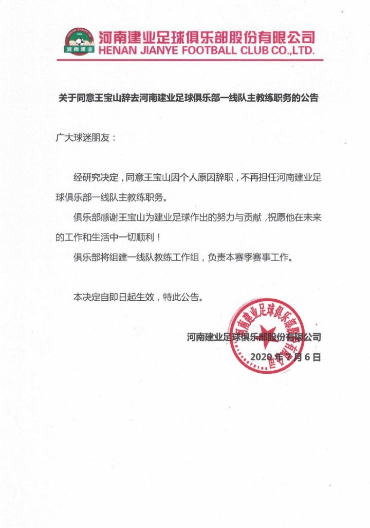 2020年7月6日,在中超联赛还有19天就要复赛开始新赛季的时候,河南建业足球俱乐部毫无征兆的突然宣布了王宝山离任的消息。