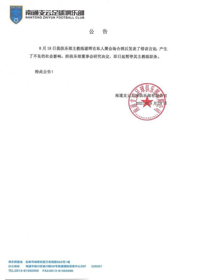 马上,南通支云俱乐部便对此事做出了反应,发布了谢晖暂停球队主教练职务的公告。