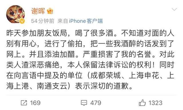 “昨天参加朋友饭局,喝了很多酒。不知道对面的人别有用心,进行了偷拍,把一些我酒醉的话发到了网上。并且添油加醋。严重损害了我的名誉。对此类人渣深恶痛绝,本人保留法律诉讼的权利!同时在向言语中提及的单位(成都蓉城、上海申花、上海上港、南通支云)表示深切的道歉。”