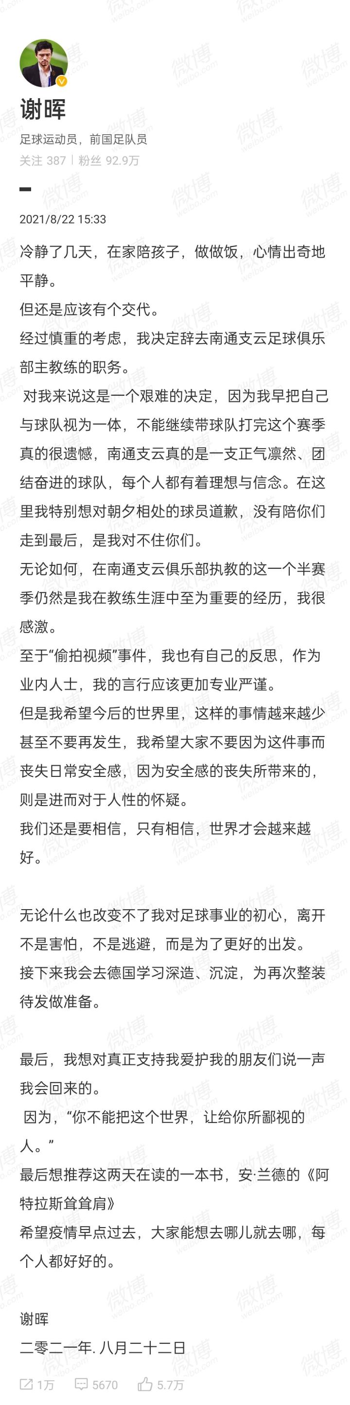 几天之后,谢晖宣布了自己辞职的消息,他决定辞去南通支云俱乐部主教练一职,前往德国继续深造。