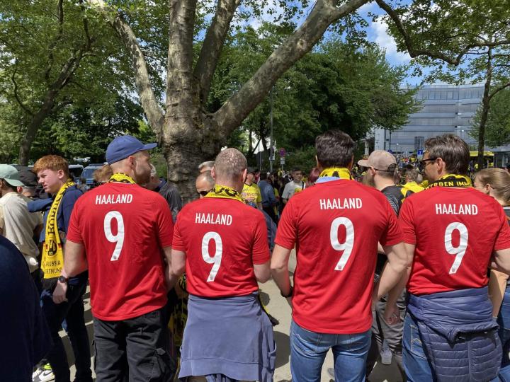 许多穿着哈兰德球衣的年轻球迷走过,他们每个人对于哈兰德的欣赏感激之情都溢于言表。其中有几人站了出来:斯文、奥利、迈克和克里斯蒂安骄傲地披着印有哈兰德名字的挪威国旗,从奥斯陆一路赶来,见证他们偶像代表多特的最后一战。“他应当再待久些,”斯文坚称道。