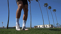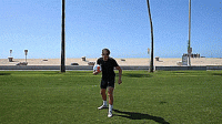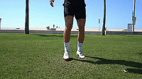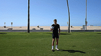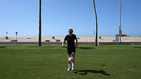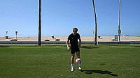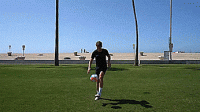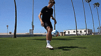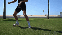 首先是跨过球让球落在大脚脚趾上,触球时稍微抬起脚尖,将球直接弹向空中,然后这次我们旋转180度,用同一只脚,做脚尖弹球,我们要抬起我们的腿,让球与脚后跟接触,直接向上击球。