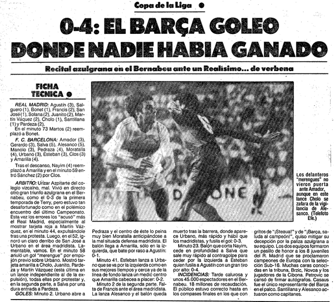 5、1986年5月18日,巴萨在联赛杯第2轮次回合客场4-0战胜皇马,以6-2的总比分晋级下一轮。阿马里亚上半场为巴萨梅开二度,奥尔特加和维戈下半场为巴萨锁定胜局。