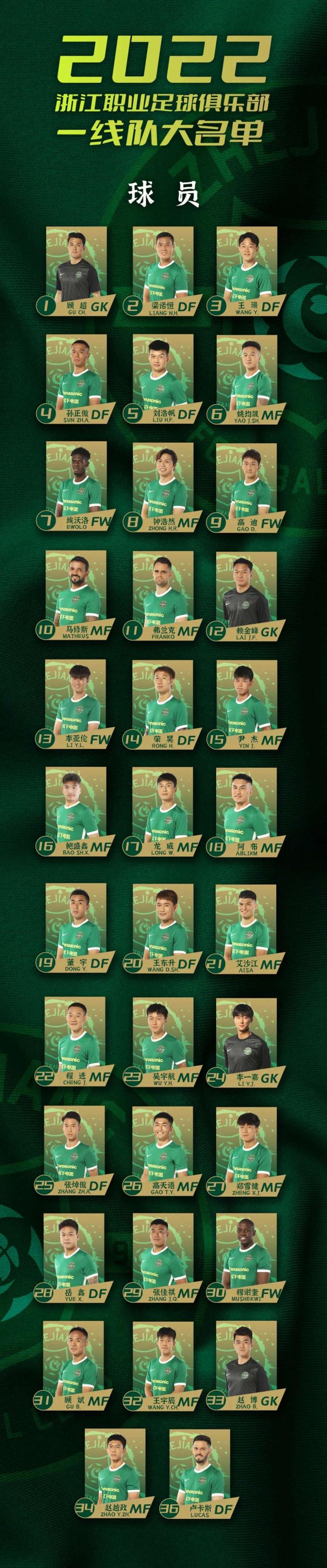 2022赛季浙江队大名单出炉来源:@浙江FC