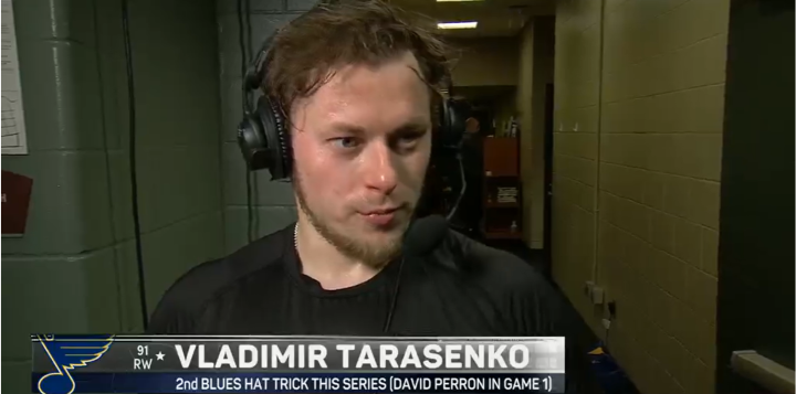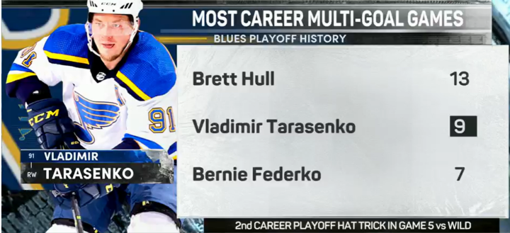 塔拉申科已经有9场季后赛单场打进2+球,在蓝调队史仅次于布雷特·赫尔(13场)。由于GAME 1中的大卫·佩隆也完成了帽子戏法,因此与狂野的这个系列赛成为蓝调队史首个有自家球员两次上演帽子戏法的系列赛。