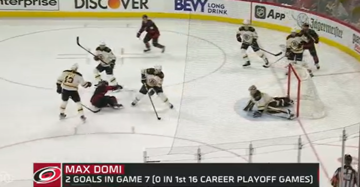 在抢七战中,谁也没想到,有一名此前表现不突出的球员突然挺身而出了。距离首节还剩1分24秒,斯拉文把球传至门前,马克斯·多米迅速传给特拉维宁,后者迅速射门把球打进!飓风打破场上僵局。第二节开场3分多钟,飓风在攻区控制球权,乔丹·斯塔尔的射门被棕熊的汉普斯·林德霍尔姆用杆挡了一下,但是球来到了马克斯·多米杆下。马克斯·多米面前正好是门将斯威曼和球门之间的巨大空当,趁着斯威曼还没缓过神来,他挥杆射门把球打进。没过多久,德布鲁斯克为棕熊扳回一球。进入本节中段,德布鲁斯克的射门击中左侧门柱后,飓风持球进入攻区,特拉维宁传至中路,马克斯·多米抢在查理·科伊尔破坏之前,One-Timer迅速挥杆射门把球射进!这名并不显眼的球员在抢七战中梅开二度另有1次助攻,帮助飓风3:1扩大优势。此后,飓风的防守滴水不漏,棕熊屡次进攻都没有取得进球。尽管帕斯特尔尼亚克在第三节最后时刻进球,但时间只剩22秒,棕熊即使有心但时间已耗尽,最终只能接受2:3的失利。飓风赢得抢七战的胜利。