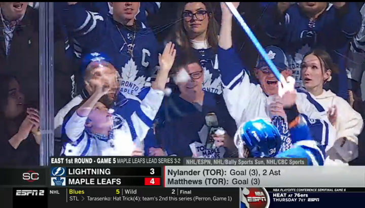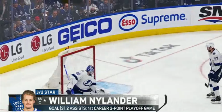 枫叶vs闪电G5天王山之战,威廉·尼兰德单场三分,奥斯顿·马修斯进球助队领先并最终取胜。