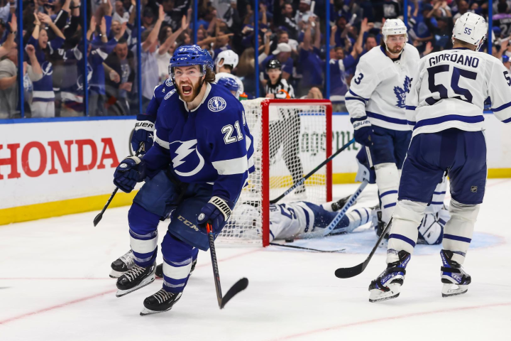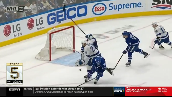 闪电可不想让系列赛终结于坦帕湾。在G6比赛中,闪电也是先进两球,其中奇雷利的进球把乔达诺搞得毫无脾气可言。不过枫叶强势给出回应,奥斯顿·马修斯的进球属于常规操作。最后一分钟,枫叶连续发威,斯佩扎带球分给塔瓦雷斯,塔瓦雷斯射门被瓦西列夫斯基用手套扑出,但斯佩扎把球补进,枫叶扳平比分。26秒后,凯尔福特在边板墙把球交给威廉·尼兰德,后者回传给塔瓦雷斯,塔瓦雷斯Snap Shot再次攻破瓦西列夫斯基把守的球门。枫叶第二节结束已经把比分反超了。第三节,闪电抓住5打3的大好机会,波因特回传库切罗夫,后者得球后蓄力一杆,球打了杰克·坎贝尔的左手套侧取得进球!此后闪电把3:3的比分保持到常规时间结束。首个加时赛还剩最后2分钟结束之际,黑格尔抢断奥斯顿·马修斯,闪电发动反击,吉隆第一下射门被挡,波因特补射得手!卫冕冠军4:3取胜,将比赛带入抢七。