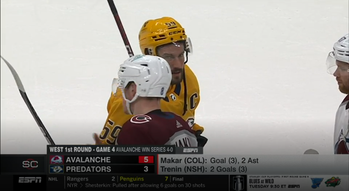 G4,命悬一线的掠夺者摆开搏命的架势。尽管雪崩再次成为先进球的一方,但掠夺者没有放弃。本场担任进攻三组的特雷宁梅开二度,帮助掠夺者两次把比分扳平。第三节,福斯贝里的进球让掠夺者一度反超比分。但掠夺者此后太过保守,再加上雪崩的尼舒什金发挥抢眼,导致掠夺者连丢两球,再次陷入落后。此后掠夺者撤下了门将奋力一搏,但还是被雪崩的麦金农偷了个空网进球。最终雪崩5:3赢下G4,以大比分4:0横扫掠夺者。雪崩成为了首支晋级分区半决赛的球队。