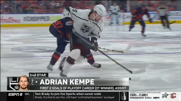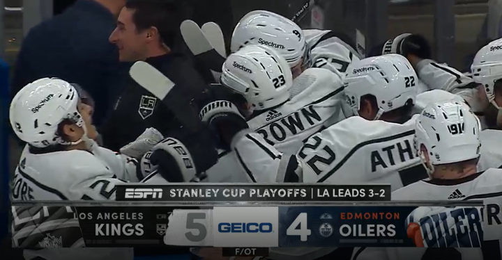G5在埃德蒙顿开锣。首节,斯特彻接到埃德勒的传球,Slap Shot射门打在球门左上角为国王首开纪录。次节,麦克戴维助攻扎克·卡西安把比分扳平。但随后,油人后防线两次在防区的失误直接把球给了对手。先是亚法罗断球,科皮塔尔传给阿德里安·肯佩,后者巧妙地把球的射门路线用冰刀遮住,随后把球拉出,突然的一杆射门让迈克·史密斯来不及反应,球进了,国王再次把比分超出。随后国王的18季元老达斯汀·布朗成功断球后把球分到左路,阿森纳修的进球将比分扩大到3:1。第三节,麦克戴维单刀面对门将奎克,反手推了一杆把球打进。但随后达诺尔特的进球让国王4:2领先。危急时刻,油人另一位核心球员德拉塞特尔站了出来,他连续打进短手球和多打少进球,帮助油人4:4把比分扳平进入加时。但在加时赛中,阿德里安·肯佩上演单骑闯关,拉球绕过迈克·史密斯的护腿板,把球轻松推进。他的加时制胜进球,离加时开始仅1分12秒的时间,国王客场赢下天王山。