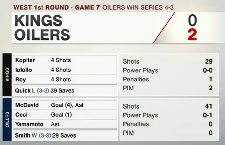 两队不得不在埃德蒙顿继续打抢七。前30分钟,两队老门将各种扑救表演令人一片感叹。第二节还剩6分55秒,麦克戴维在球门后观察传球时机,终于发现了希西,后者小角度射门把球打进!油人打破僵局,1:0领先。国王此后致力于扳平比分,但防守出现漏洞,幸亏老门神奎克发挥稳健才没让球门再失手。当第三节还剩4分4秒时,名场面出现:麦克戴维强行超车甩开杜尔齐,冲到门前,先是在右侧一杆射门被奎克挡出,随后得球绕到球门另一侧掖门被奎克用护腿板挡出,球还在麦克戴维控制下,奎克没能挡住麦克戴维的反手一杆射门。此后,0:2落后的国王无力反扑,只得接受抢七失利的结果。