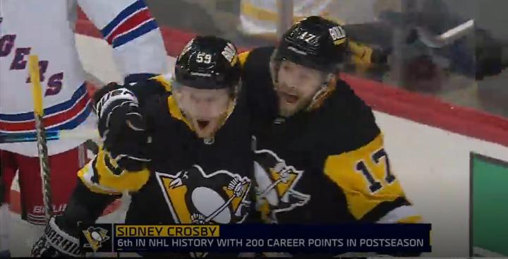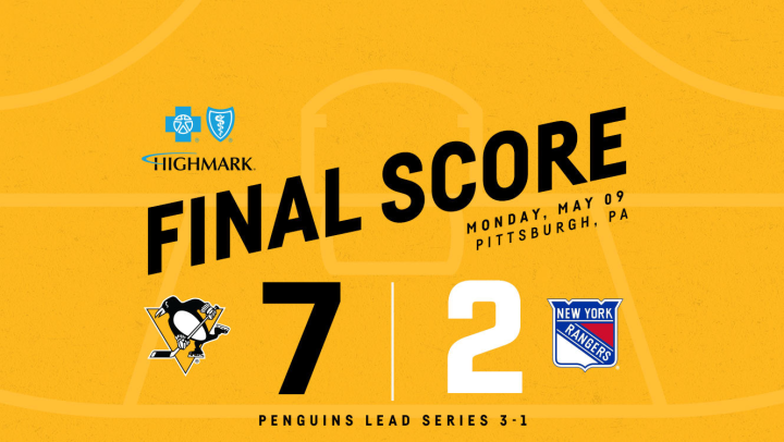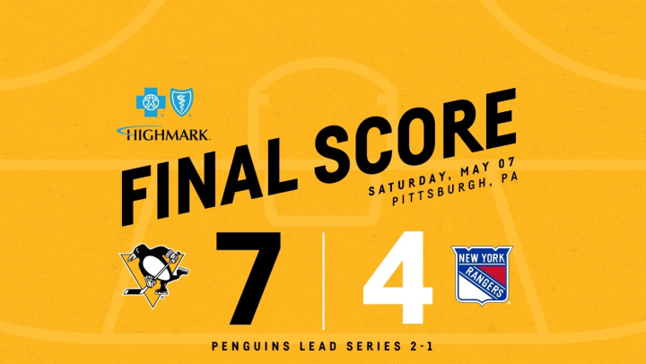 G7来到纽约麦迪逊广场花园。企鹅的克罗斯比缺战G6后复出,门将雅里也是时隔1个月后迎来复出。这次终于轮到游骑兵先进球,齐巴内贾德助攻克莱德尔Slap Shot取得进球。企鹅在首节比赛结束前扳平比分。第二节,金策尔用冰刀把球踢了一下,抢在舍斯特尔金之前把球点进球门,企鹅2:1反超比分。莱安·斯特罗姆分球给坎德烈·米勒,后者射门击中了企鹅球员冰刀上,球就这样滑进了球门。但游骑兵没高兴太久,奇提尔的传球失误,球直接打到了埃文·罗德里格斯身上,后者得球后一路突到门前,面对舍斯特尔金反手一杆把球射进,企鹅3:2再次超出比分。末节,齐巴内贾德接到安德鲁·科普的回传球,挥杆射门,球直窜左上角而入!游骑兵在还剩5分55秒时把比分扳平,把比赛拖入加时赛。加时赛开场4分46秒,游骑兵在攻区控球,亚当·福克斯把球交给帕纳林,后者调整角度看准了两名防守球员之间的空当,挥出一杆把球打进!这粒加时绝杀让游骑兵4:3赢下抢七,总比分4:3实现逆转,挺进东部半决赛。