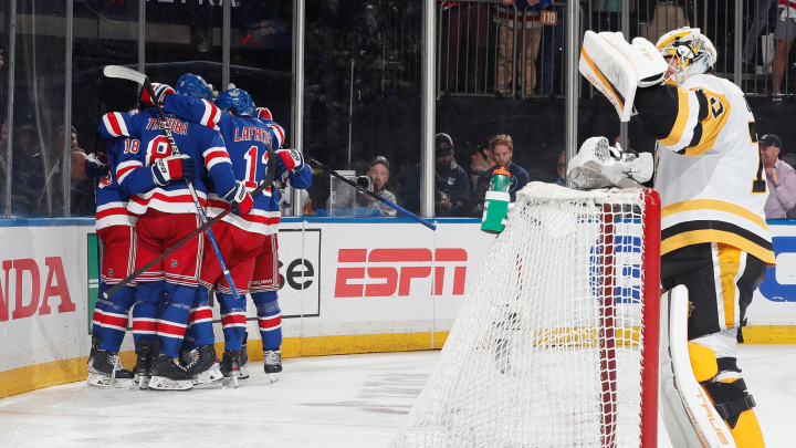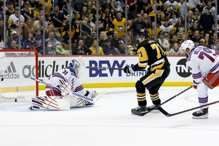 两队的G1在麦迪逊广场花园打响。前两节,游骑兵在2:0领先后,被金策尔连进两球扳平。克莱德尔随后打进短手球,布莱恩·拉斯特迅速用多打少进球做出回应。两队3:3战平进入第三节后陷入胶着,进入加时后仍无进球出现。比赛来到了第三个加时,马尔金终于在开局6分钟打入制胜进球,企鹅4:3艰难拿下G1胜利。游骑兵在G2中提升了进攻强度,莱安·斯特罗姆、帕纳林、克莱德尔全部收获进球,尽管企鹅也有金策尔和克罗斯比的强势发挥,但第三节前半段游骑兵连进两球,还是让企鹅2:5败下阵来。接下来的G3和G4,对于游骑兵门将舍斯特尔金而言无疑是一场重大的灾难。企鹅的攻击手们展开了铺天盖地的攻势,第一节就打进四球,舍斯特尔金不得不被提前换下。尽管游骑兵在第二节连进三球把比分扳平,但第三节后半段,企鹅连进三球,还是让企鹅以7:4获胜。G4是舍斯特尔金噩梦的延续,这次企鹅攻击手们把密集的炮弹倾泻在第二节,克罗斯比、金策尔、杰夫·卡特相继进球,舍斯特尔金单节狂丢五球,不得不再次被提前换下。游骑兵连场丢7球,带着总比分1:3回到了纽约。匹兹堡的报纸,更是用'Shesturkey'来调侃挖苦舍斯特尔金的糟糕发挥。