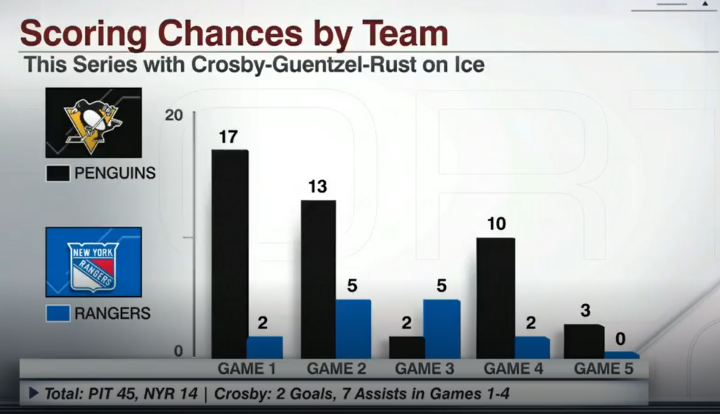 接下来的比赛对于游骑兵而言,就是win or go home了。游骑兵主帅加兰特选择再次相信舍斯特尔金,他出战了G5。金策尔和勒唐的进球让企鹅2:0领先。此时,麦迪逊广场花园上空到处是'Igor'的喊声,游骑兵球迷仍然在支持者他们的门将。随后,企鹅头牌克罗斯比受伤下场,未能回归。游骑兵没有放弃,亚当·福克斯的进球吹响了反击号角,此后拉弗伦涅尔和特鲁巴的进球帮助游骑兵在145秒内连进3球反超比分!但游骑兵没高兴太久,金策尔就梅开二度。两队3:3进入末节。末节开场3分钟,拉弗伦涅尔鬼魅传球塞给了奇提尔,后者挥杆面对多明戈大力击射球门左上角而入,游骑兵再度反超比分!此后企鹅久攻不下之际,还让林德格伦打进了空网球。游骑兵5:3取胜赢下G5,大比分变为2:3。