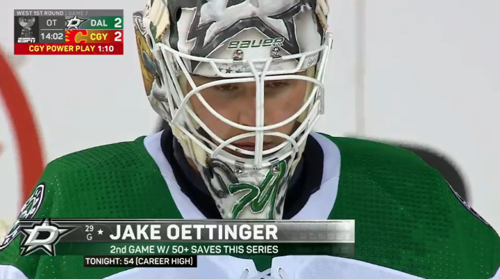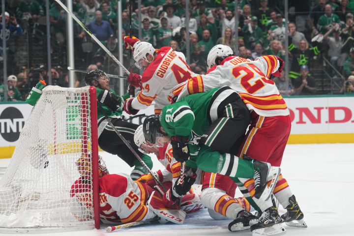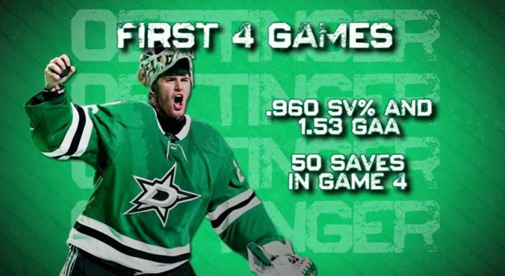 G1在卡尔加里开打,两队进球寥寥,比赛成为门将表演的舞台。火焰由埃利亚斯·林德霍尔姆在开场5分钟打入多打少进球,门将马克斯特伦把星的16次射门全部拒绝,火焰1:0小胜取得开门红。G2再战,星队核心帕维尔斯基在开场7分48秒打破僵局,此后奥廷杰一次又一次让火焰的射门无功而返,比赛最后时刻,拉夫尔的空网球让星2:0赢回一场。G3来到达拉斯,法克萨为星首开纪录,但火焰此后连进两球反超比分。此时帕维尔斯基再次站了出来,连进两球把比分再次反超。火焰只能再次围攻,但久攻不下后,罗普·辛茨在比赛还剩最后一秒之际打进空网球,星4:2取胜把大比分反超。两队在G4的首节均无进球后,火焰由拉斯姆斯·安德森打破场上僵局。随后奥廷杰用一个海底捞月的动作,强势把近在咫尺的射门抓在手套里。而第三节,星队后卫克林伯格用球杆粗暴勾倒已处在反击带球状态的约翰尼·古德罗,被判罚点球。约翰尼·古德罗面对奥廷杰,做出假动作后射门,球穿过奥廷杰两腿间滑进球门。此后火焰打进第三球,尽管泰勒·塞金扳回一球,但星仍以1:4落败。