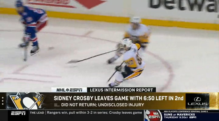 克罗斯比G5次节伤退后,G6缺阵,G7轻伤不下火线复出。但遗憾的是,企鹅还是最终输掉了抢七战。