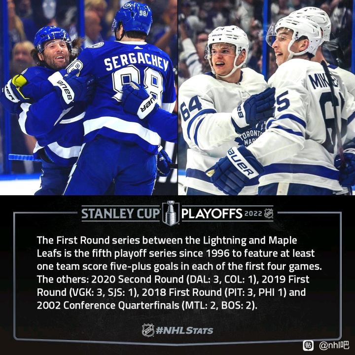 本赛季季后赛首轮枫叶vs闪电的系列赛,前四场比赛总有至少一队单场能够进5+球。这是历史上第五个做到这一点的系列赛前面四组系列赛中,在首场打进5+进球的球队,最终都晋级了。那么,按照这个规律,会是枫叶晋级吗?