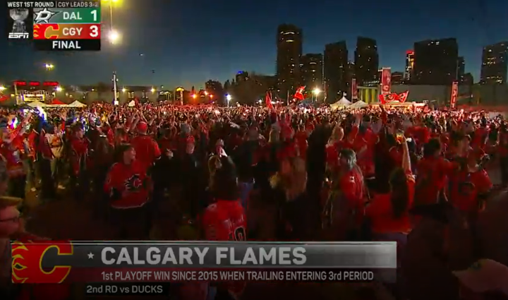 天王山之战在卡尔加里打响,首节双方继续没有进球。第二节,利用一次反击机会,星队老将杰米·本把球择出,给到贾森·罗伯特森,后者射门被门将马克斯特伦挡出,但哈尼芬的冰刀打到了球,球弹起后飞入了球门。星就这样先进球了。第三节,巴克隆德射门被挡后,曼贾帕内得球后转身送出横传,埋伏在后点的巴克隆德用球杆一垫把球射进,帮助火焰扳平比分。巴克隆德随后在边板墙与格伦登宁争抢球权获胜,随后他传给曼贾帕内,后者挥杆射门取得进球!火焰就此把比分反超。随后,帕维尔斯基有绝好的进球机会,但马克斯特伦防下了这次射门。最后时刻,约翰尼·古德罗面对空门射偏,但特雷沃·刘易斯补射破门。火焰3:1拿下天王山。