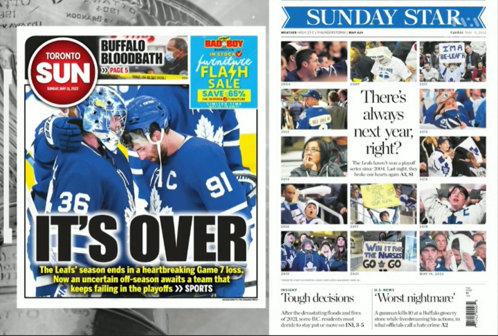 枫叶被淘汰后,多伦多当地媒体难掩失望。报纸头条写着大大的'It's over!','There's always next year,right?'枫叶自2004年以来再没有突破过首轮了,这样的魔咒还在延续。