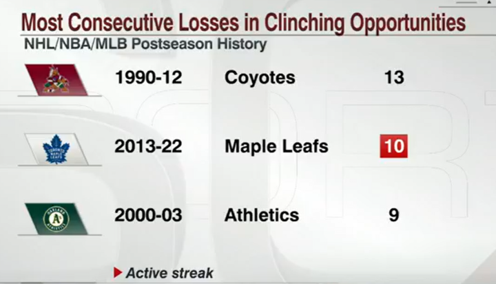 枫叶在可以取胜而紧急系列赛的比赛中所遭遇的10连败是目前的最长纪录,是北美三大体育联盟里第二长的连败纪录。