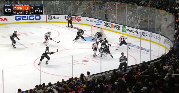 G1在埃德蒙顿开打,国王给了油人当头一棒。首节中段,国王在亚法罗进球后取得2:0领先,随后油人把比分扳成3:3平。第三节还剩5分14秒,迈克·史密斯刚救完火,杜尔齐在蓝线处的射门击中达诺尔特的球杆折射入网,国王4:3取胜。油人在G2提升了进攻强度,在首节双方都无进球后,次节德拉塞特尔终于为油人先进球。进入第三节,已经3:0领先的油人还没有收手,伊万德·凯恩上演梅开二度,加上他给到普柳贾维的助攻,迈克·史密斯30次扑救力保球门不失。油人6:0完封拿下G2。G3来到洛杉矶,国王在比赛的前30分钟就已经连丢五球,主帅麦克勒兰不得不把主力门将奎克换下。次节最后时刻,国王连进两球。但第三节,纽金特·霍普金斯在81秒内连进两球,伊万德·凯恩最后时刻锦上添花,个人完成帽子戏法的同时,把最终的比分定格在8:2。两场狂丢14球的国王终于在G4作出回应,奎克满血复活做出31次扑救取得完封,第三节,格朗德斯特伦更是神兵天降连进两球,最终国王4:0击败油人,大比分来到2:2平。