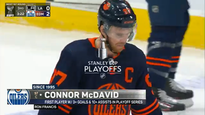康纳·麦克戴维是自1995年的弗朗西斯以来,首位在一个季后赛系列赛中拿下3+进球和10+助攻的球员,他也成为自1989年的马克·梅西耶以来,首位在单个季后赛系列赛中送出10+次助攻的油人球员。