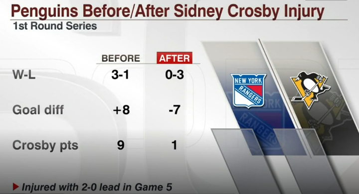 克罗斯比缺阵对企鹅而言,有着非常严重的影响。企鹅已经连续4个赛季止步季后赛第一阶段了(2020为季后赛资格赛1:3不敌加拿大人)。