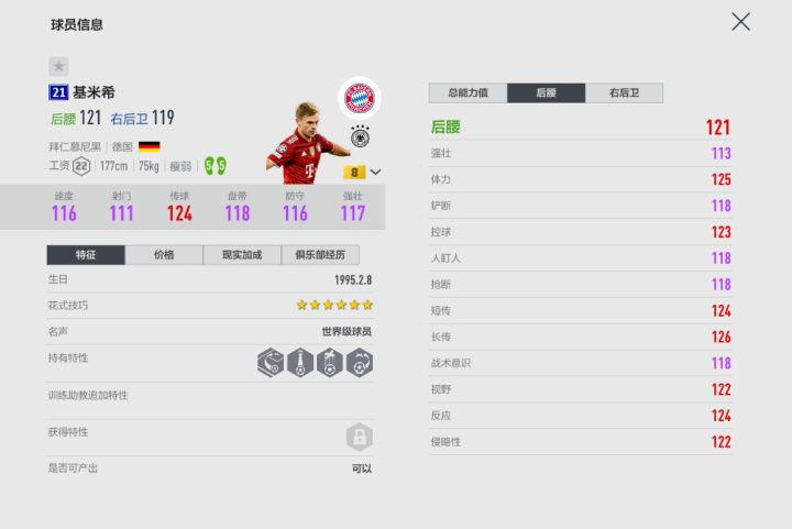 游戏里,基米希的巅峰赛季是22TY,而21U的推出也使玩家多了一个选择。使用过基米希的玩家都会感受到,他的手感较为舒服,重心低,变向转身相对比较顺畅,小范围内的摆脱能力出色,算得上是瘦弱模型中最顶级的那一档中场球员。尽管默认位置是后腰与边后卫,但必须承认他的远射丝毫不亚于前腰球员,远射打门的球速和角度可以和前辈马特乌斯媲美,进球效率很高。当然,他最适合的还是双后腰位置,双五脚的出球能力以及边路的速度使他在后腰位置如鱼得水,虽然受限于模型很难起到维埃拉等球员的作用,但搭配戈雷茨卡这样的大个子还是能很好地发挥他全能的特点。