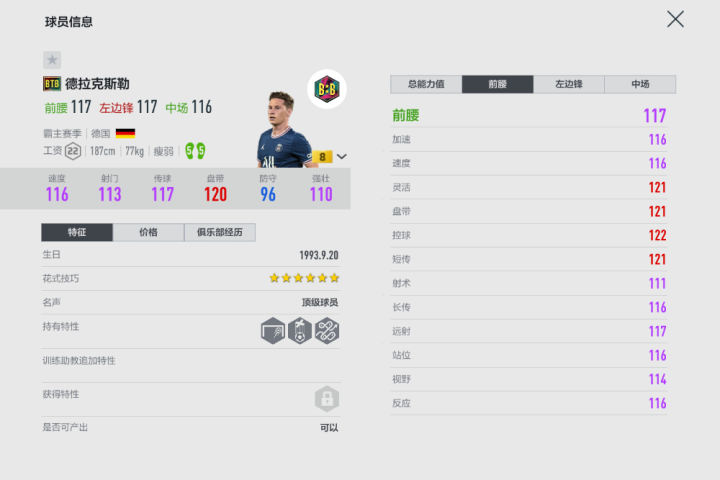 游戏里,这张BTB德拉克斯勒相比较EBS赛季在身体对抗上有了明显的提升,而且有搓射高手特性的他在对方禁区内的打门还是很稳定的。虽然是名大个子球员,但他在实战里的手感非常出色,转身、花式盘带以及在底线附近的处理都能够通过很细腻的方式完成,这一点还是值得肯定的。不过,他的优势还是在于传球和远射,尽管双速不算低,但反击时还是能明显感受到他的奔跑能力要略逊于顶级边锋,因此这里更推荐玩家把他放在球队的前腰位置,充分发挥他身高和手感优势,多使用左右脚的搓射来完成进攻。 好了,以上就是本期现役双五脚中场球员推荐,不知道各位小伙伴们有没有用过这些出色的中场球星呢?他们与各自队套的传奇球员相比,谁更能获得玩家们的青睐呢?欢迎在下方评论区留言交流哦!
