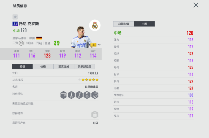 在游戏中,21U克罗斯与EBS并列克罗斯能力值第二的赛季卡,但从数据来看21U的射门能力及跑位意识是要远超其他赛季的,而且有着搓射高手特性,所以门前把握机会能力相当出色,特别是大禁区外的搓射相当精准。此外,克罗斯也同样属于手感细腻的球员,之所以把他放在这一期,是因为他的对抗能力也要比预想的更出色,新卡的强壮数据达到了124,使他在对抗情况下的出球更有把握,再加上双五脚的加持,队套玩家们应该会相当喜欢用这张克罗斯。目前,21U赛季金卡获得还比较有难度,也可以用价格较低的EBS金卡作为过渡,因为两张卡的传球及带球手感是相差不大的,只是21U卡量少,且由于皇马闯入决赛,仍有涨能力值的空间。