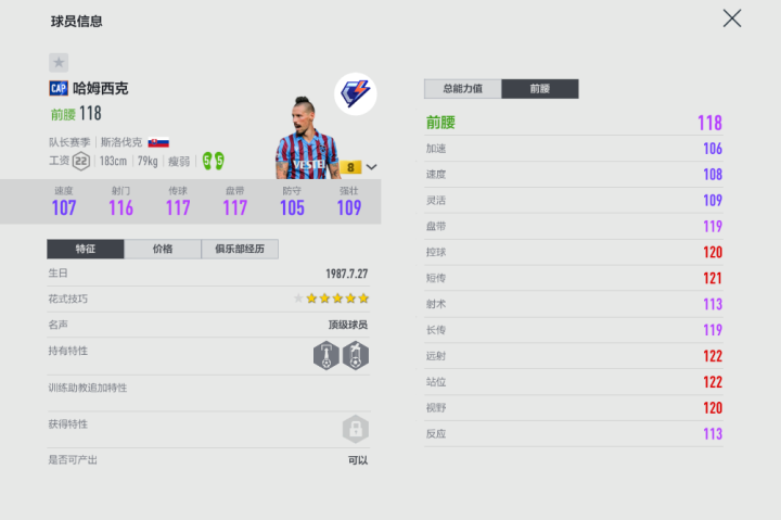 在游戏中,哈姆西克由于户口的原因,并不算特别热门,但这张卡还是很有特点的:远射、站位、短传、视野、控球等前腰的相关属性都在130以上,而双速却不到120。从实战的表现来看,哈姆西克整体的表现中规中矩,优势在于接应拿球后的手感,传接球非常稳定,特别是长传可以称得上是游戏最强的那一档。而远射、直塞球由于双五脚的原因,整体命中率也很高。不过,考虑到他的速度不快,而且强壮属性也较低,他的作用相对有限,特别是在快节奏的攻防转换中很难指望他能够突然加速拦截对手的出球。总的来说对队套玩家是一个很好的补强。