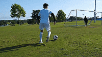 我们可以试试运气,把一只脚放在另一只脚的前面,用我们的脚后跟把球打向球门。如果我们是一个高手,也许我们甚至可以穿裆射门。
