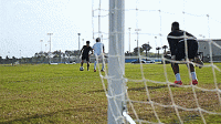 这时我们要射高一点,让他们更难阻挡球。