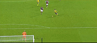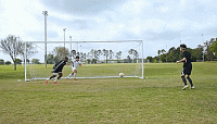 然后把球射向守门员的一侧的近门柱,将球挑过守门员张开的双臂和双腿。