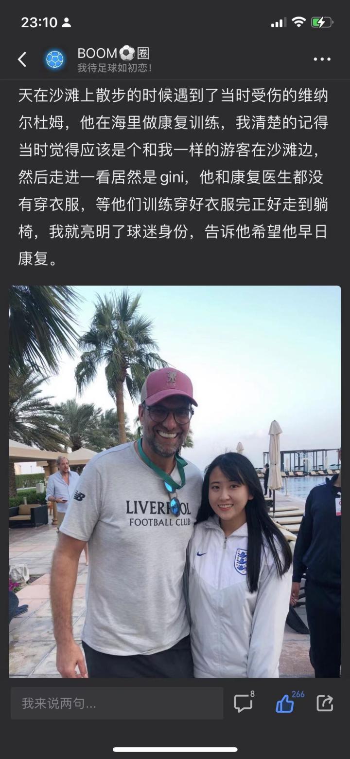 去卡塔尔看世俱杯的的时候我和球队住在同一个酒店,经常能遇到球员和教练组。由于当时球队刚签约了南野拓实,克洛普以为我是来自日本的追随者。所以跟我交流了一下。我告诉他我来自中国,这有点出乎他的预料。对他的印象非常亲切。