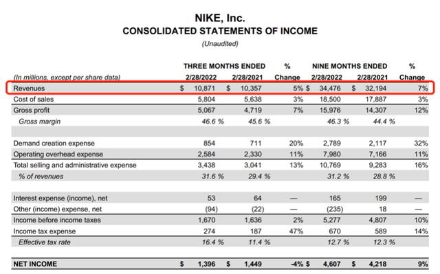 耐克同样不及预期,截至2022年2月28日,耐克总销售额同比增长5%至108.7亿美元,净利润下滑4%至14亿美元。财报显示,截至2021年11月30日的第二财季,耐克大中华区销售收入大跌20%至18.44亿美元;截至2022年2月28日的第三财季,耐克大中华区收入同比下降5%至21.6亿美元。