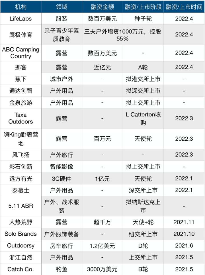 各地疫情防控反复之下,出境游、跨省游受到限制,而亲近自然、私密化的户外露营成为了新的“风口”,深受资本市场的追捧。据媒体不完全统计,户外市场1年,就产生了11起投融资事件,涉资超13亿元。