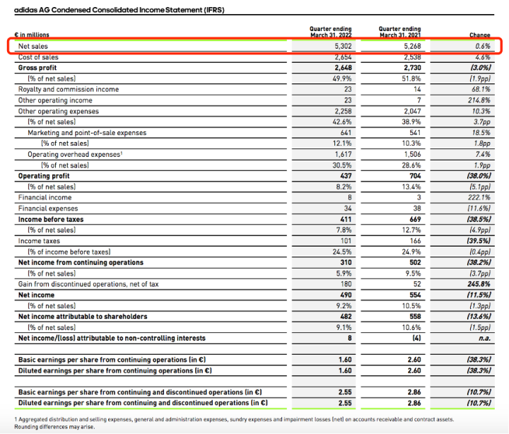 北京时间2022年5月6日,阿迪达斯发布了2022年一季度财报,根据财报数据,阿迪达斯2022年一季度总销售额为53.02亿欧元,2021年同期为52.68亿欧元,同比仅上涨0.6%。营业利润出现严重下滑,下降38%至4.37亿欧元,营业利润率下降超过5个百分点至8.2%。同时,阿迪达斯在大中华区的销售额同比下降28.4%。