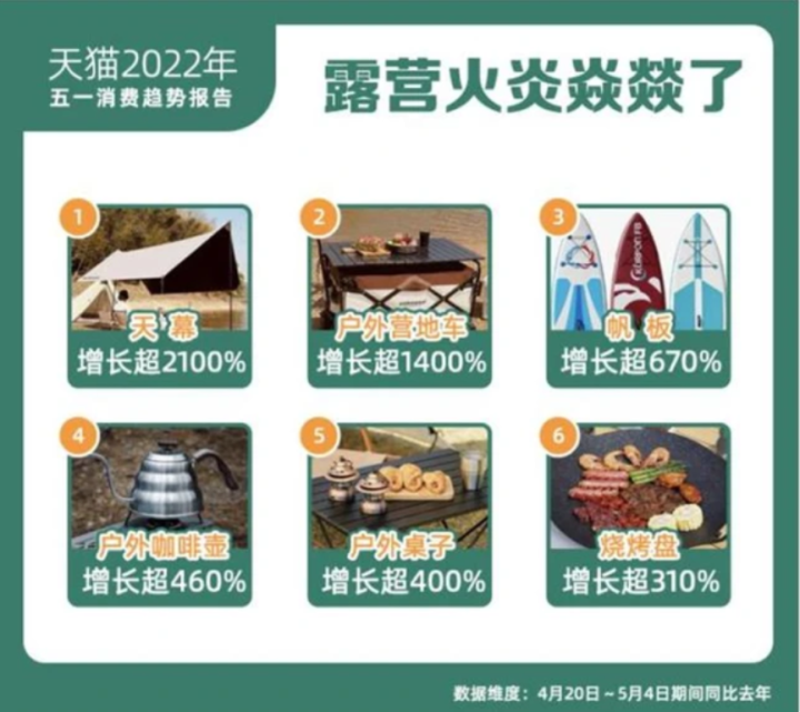 5月6日,《天猫2022年五一消费趋势报告》显示:4月20日~5月4日期间,天幕在天猫的销售额同比增长超2100%,成为绝对“顶流”。4月20日~5月4日期间,户外咖啡壶、桌椅与烧烤盘在天猫的销售额同比增长了3倍以上,成为最佳“露营伴侣”,户外电源的销售额同比增长了2倍以上。