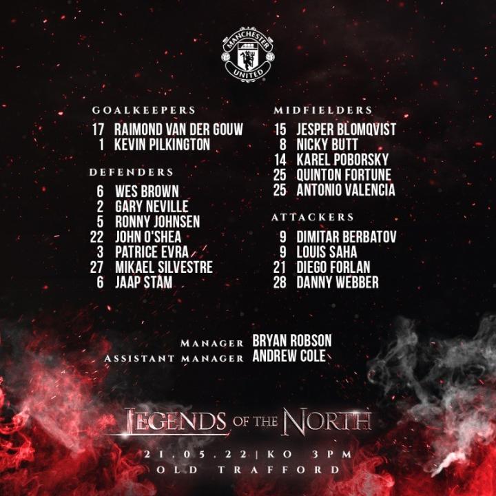 曼联官方发布消息,公布了曼联传奇队与利物浦传奇队比赛的比赛名单和号码,双方将在明天晚上22点进行“北方传奇”慈善赛。