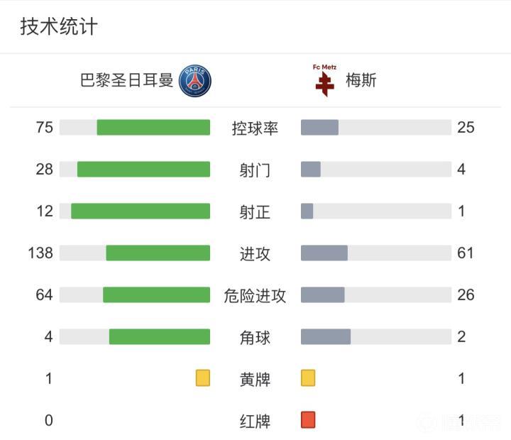 第66分钟,梅西打门击中立柱弹出,迪马利亚补射破门,巴黎5-0梅斯。