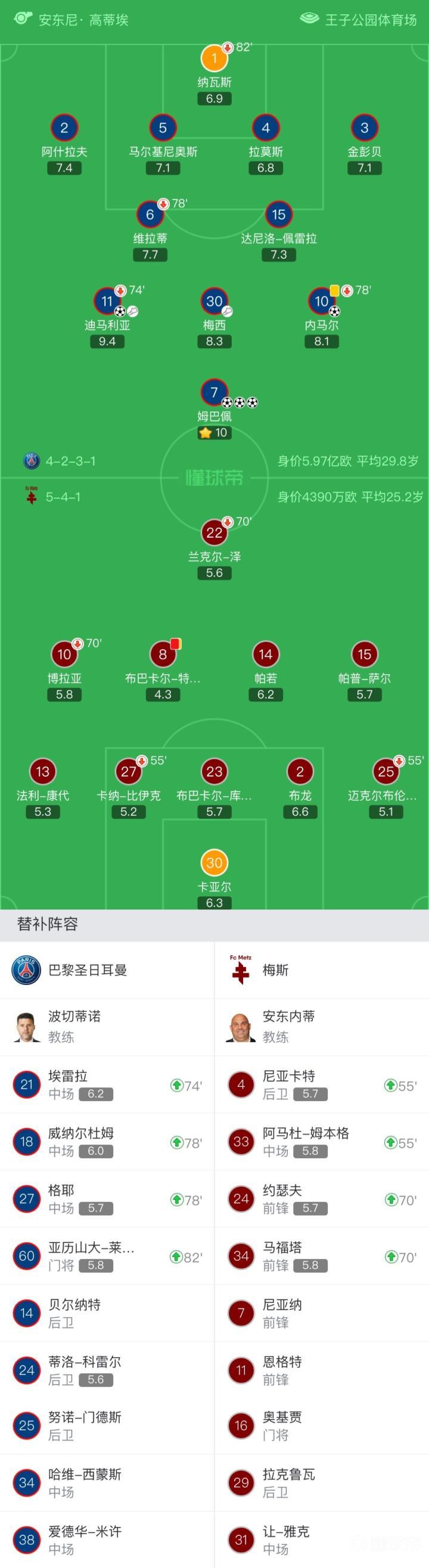 巴黎圣日耳曼首发:1-纳瓦斯(82'60-莱特利尔)、4-拉莫斯、5-马尔基尼奥斯、3-金彭贝、2-阿什拉夫(83'24-科雷尔)、15-达尼洛-佩雷拉、6-维拉蒂(78'27-格耶)、11-迪马利亚(74'21-埃雷拉)、30-梅西、10-内马尔(78'18-威纳尔杜姆)、7-姆巴佩
