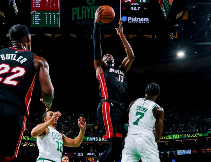 末节,热火的进攻状态渐缓,绿军则趁势打出一波小高潮将分差继续追近至个位数,本节随后时间热火的进攻仍然持续低迷,凯尔特人在布朗的带领下将分差追至1分,关键时刻阿德巴约连续取分帮助热火稳住局势,并帮助热火将胜局一直保持到最后,最后时刻斯玛特六犯毕业,全场比赛结束,凯尔特人103-109热火。