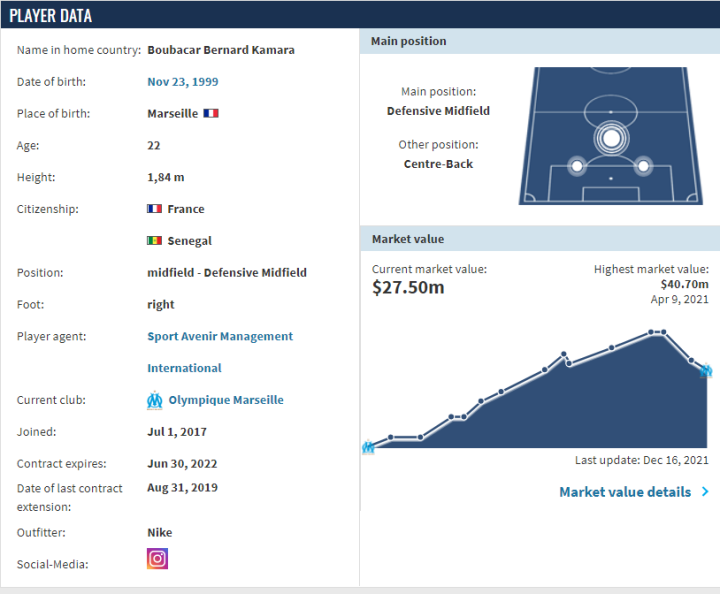 法国足球近年来人才辈出,不少希望之星得到了豪门球队的关注。而1999年出生现年22岁的布巴卡尔·卡马拉更是过去两年每一个转会窗都会跟各大豪门球队传上绯闻。今年夏天,似乎终于到了绯闻变成现实的时候。拥有法国和塞内加尔双重国籍的B·卡马拉,自小在马赛街头长大,5岁便加入了马赛青训,并在2017/18赛季顺利升入一线队。