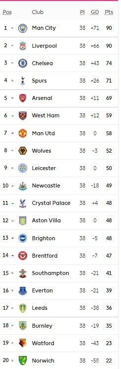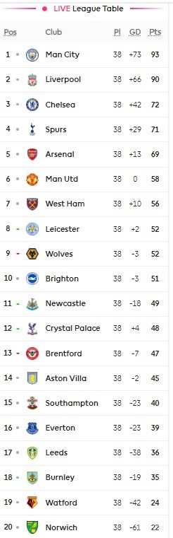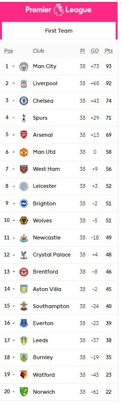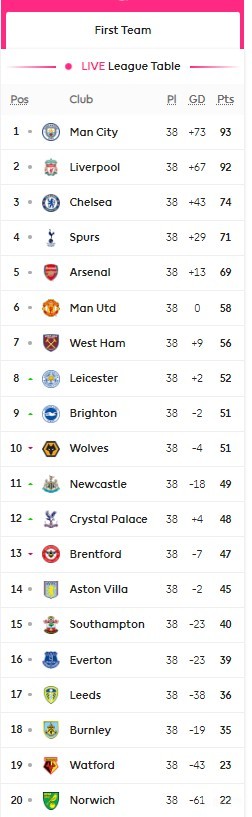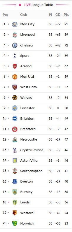 英超最终积分榜