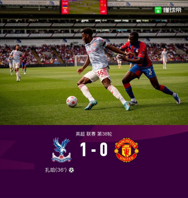 北京时间5月22日23:00,英超第38轮,水晶宫主场对战曼联。上半场卡瓦尼禁区补射打门,经折射后被扑出,之后扎哈小角度抽射,德赫亚扑出皮球,施卢普抽射,德赫亚再次扑出皮球,之后的比赛B费回传失误,扎哈得球后冷静低射破门。下半场B费任意球攻门被瓜伊塔扑住,麦克托米奈头球攻门被瓜伊塔扑住。全场结束,水晶宫1-0战胜曼联,由于西汉姆联不敌布莱顿,曼联在输球的情况下仍然能进入下赛季欧联杯。
