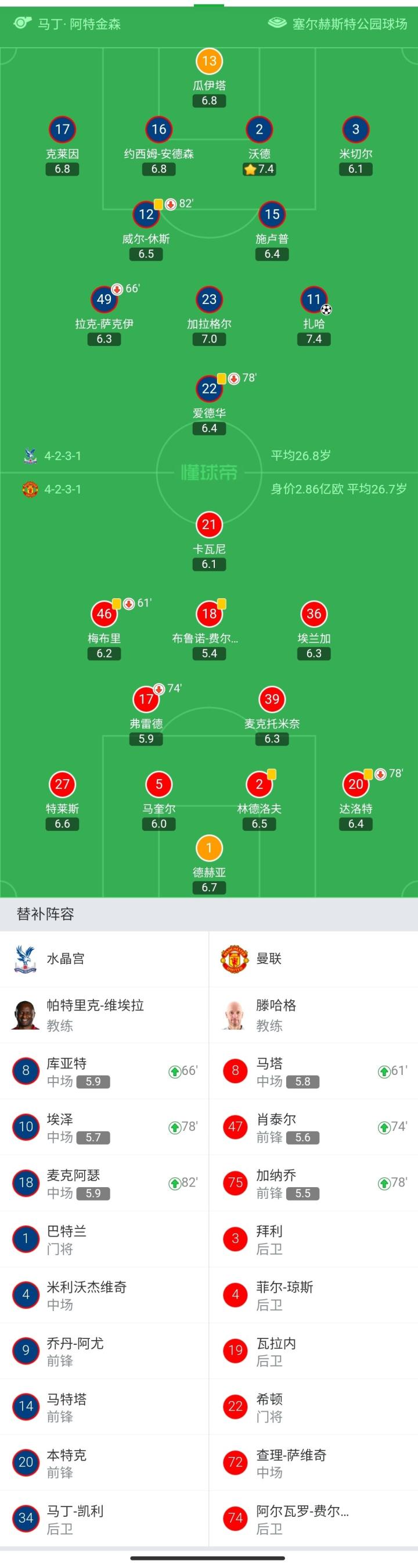 水晶宫首发:13-瓜伊塔、3-米切尔、2-沃德、16-约西姆-安德森、17-克莱因、23-加拉格尔、15-施卢普、12-威尔-休斯(82′18-麦克阿瑟)、11-扎哈、22-爱德华(78′10-埃泽)、49-拉克-萨克伊(66′8-库亚特)
