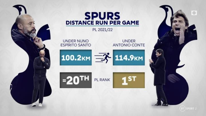 孔蒂的到来,带来的最直观的改变,在于跑动距离——努诺执教的10场比赛里,热刺的跑动距离排名联赛倒数;孔蒂到任后仅仅用了一个月时间,就令球队的跑动水平跃居联赛第一。